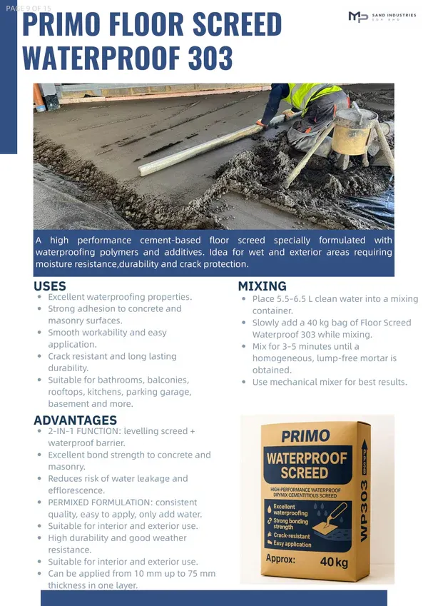 Waterproof Screed 三合一防水地台灰 is a specially blended premixed waterproof mortar designed for levelling rough and uneven concrete floors. It serves as both underlayment and overlayment, offering excellent waterproofing to prevent water seepage through concrete. Suitable for interior and exterior applications, it provides a stable base for ceramic, homogeneous tiles, marble, and granite slabs.